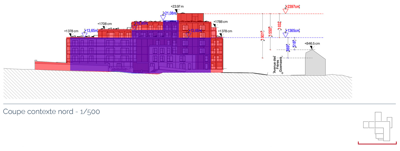 Pour les bâtiments situés Avenue des Frères Goemaere, la hauteur du bâtiment est plus haute de 10m32, passant d’une différence de hauteur sous corniche de 67cm à 11m00 pour certains et de 8m70 à 19m00 pour d’autres.